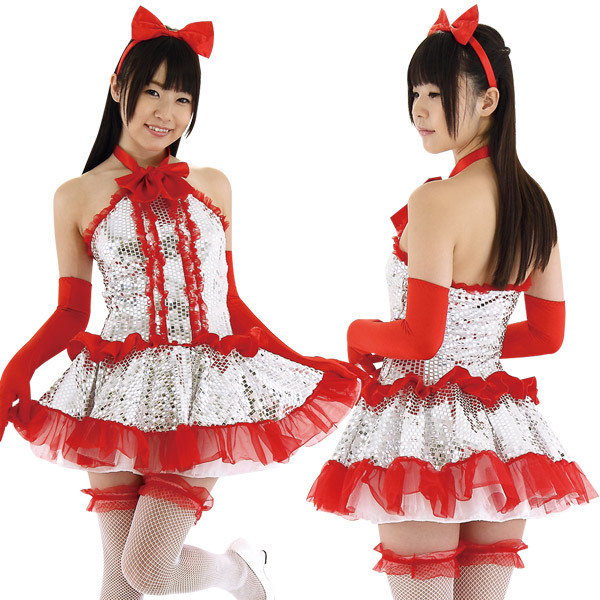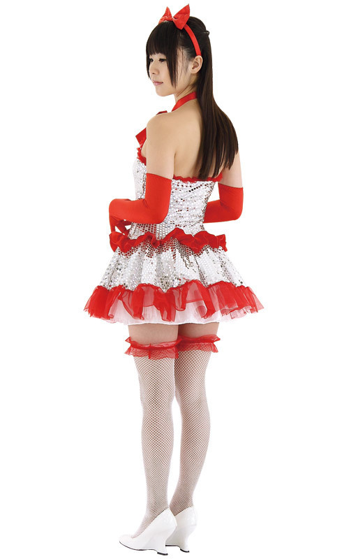 キラキラのシルバースパンコールが眩しいワンピースに、真っ赤な手袋とリボンカチューシャ、キャットガーターもセット。
