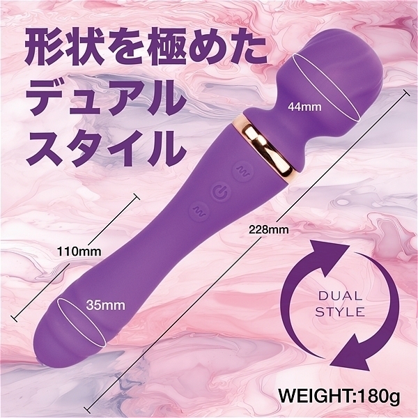 仕様:パッケージ:25.0×9.0×5.0cm 本体:全長22.8cm・電マ直径4.4cm・バイブ最大径3.5cm・挿入部全長11.0cm 重量:180g USB充電式