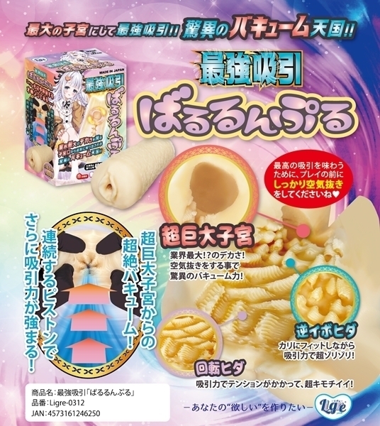 驚異の吸引力を実現した非貫通オナホです♪本体の最奥部には業界最大級のバキュームゾーンを搭載!しっかり空気抜きを行うことで、圧倒的な吸引感を体感できます♪中間部から手前に向かう回転ヒダ構造により、全体がしっかりと包み込まれ、心地よい刺激が生まれます。