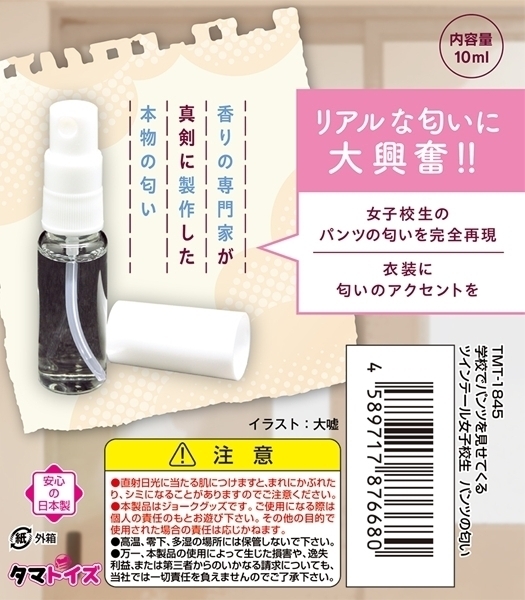 香りにこだわったスプレータイプのフェチ系グッズです♪アトマイザー入りで、ふりかけるだけの手軽な使用が可能です!女性特有のリアルな香りを再現するため、チーズ系の香りにわずかな酸味をプラスしています♪制汗剤や石けんのような清潔系の香りは含まれておらず、よりリアルさを追求した仕上がりです!オナホールやラブドール、抱き枕などと組み合わせて使うのがおすすめです♪内容量は10mlで、持ち運びにも便利なコンパクトサイズです!新製法によりエタノールを使用せず、素材にやさしい処方を採用しています♪日本国内で製造されており、品質と安全性にも配慮されています!イラストは人気絵師・大嘘氏による描き下ろしで、視覚的にも楽しめます♪香りから空間を演出したい方にぴったりのフェチ系アイテムです!●TMT-1845